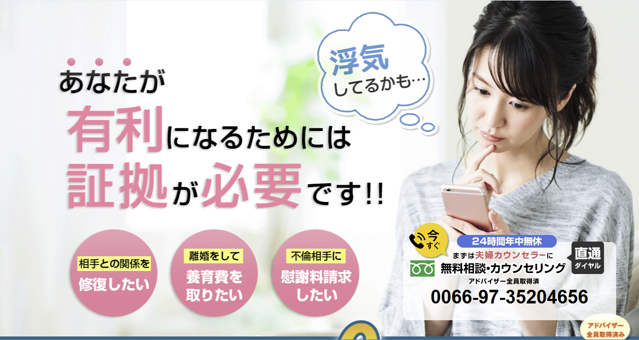 まずは、気になった探偵事務所の「無料相談」を活用してみてください。 匿名で構いません。プロの相談員があなたの状況に合った解決策を教えてくれます。