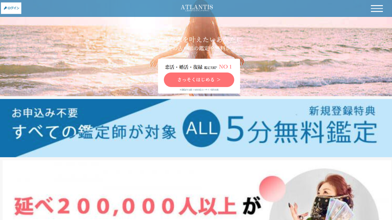 電話占いアトランティスは、初めて鑑定する先生なら何度でも5分間無料!色々な占い師との相性を気軽に試せるのが魅力です。厳選された実力派の先生が、24時間いつでもあなたの悩みに寄り添い解決へと導きます。