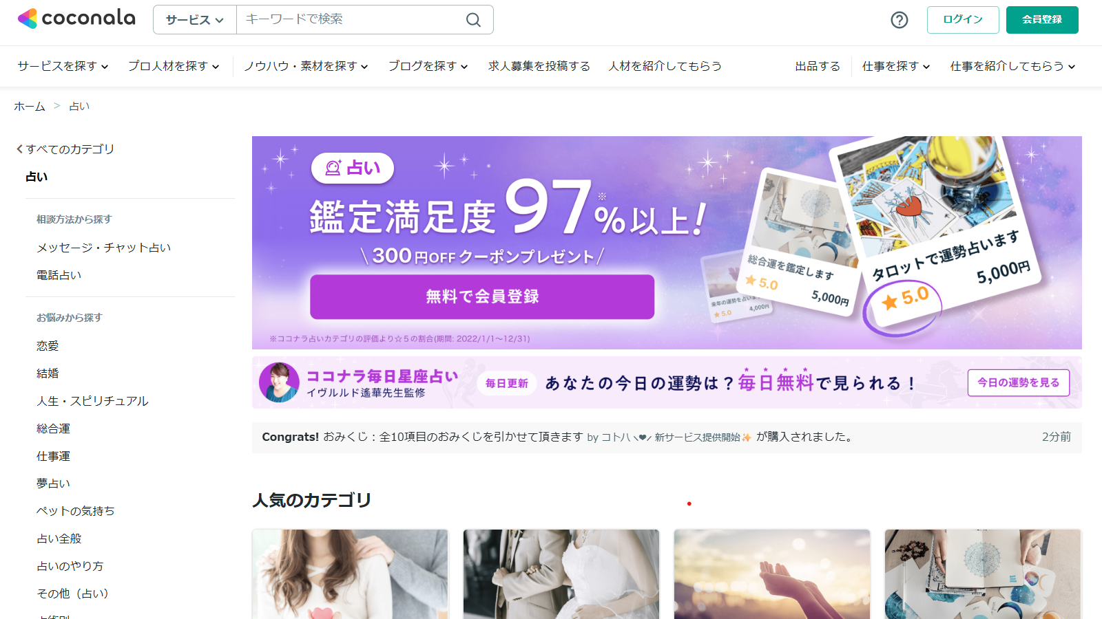日本最大級のスキルマーケット「ココナラ」の占い。豊富な占い師の中から口コミや料金を比較して自分にぴったりの先生を探せます。ワンコインから気軽に試せるのも魅力です。