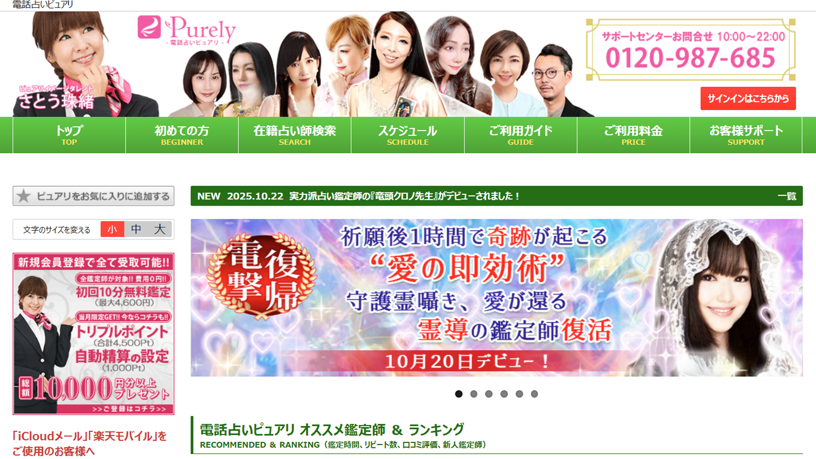 メディア出演で有名な電話占いピュアリ。総額8,000円以上お得になる豪華特典が魅力で、初回は最大4,200円分無料!厳しい審査を突破した実力派の占い師があなたの悩みを解決へと導きます。