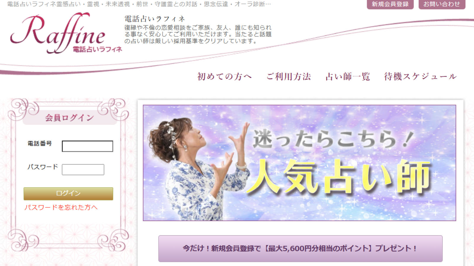 創業10年以上の老舗、電話占いラフィネ。新規登録で最大10分(2,600円分)の無料鑑定が受けられます。通話料も無料なので安心。実力派の占い師があなたの悩みに親身に寄り添います。