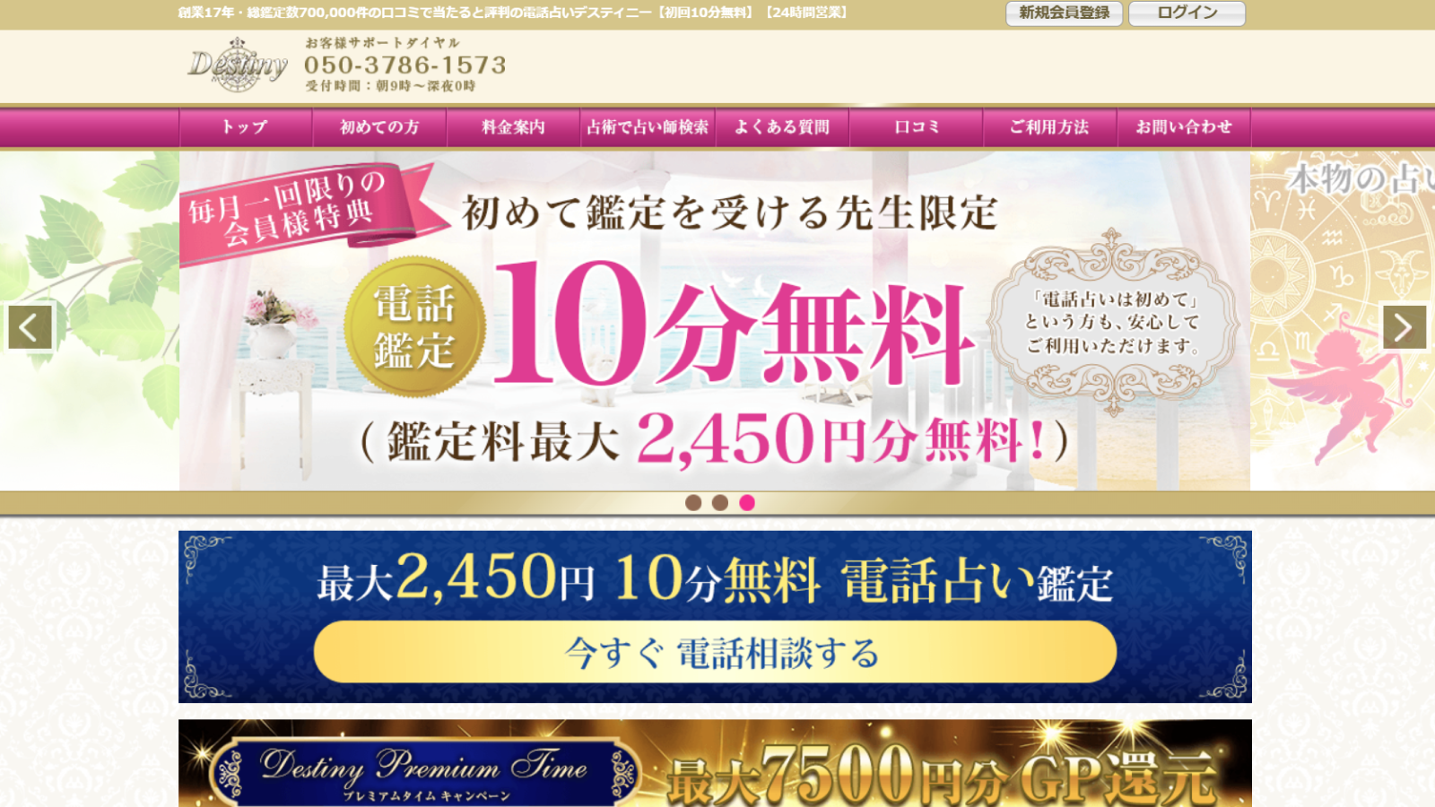 電話占いデスティニーは、初回最大2,450円分が無料!1分189円~という業界トップクラスの安さに加え、通話料もかかりません。運営実績10年以上の信頼できるサービスで、24時間いつでも悩みを相談できます。