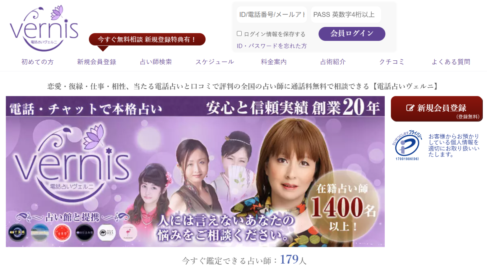 業界最大級の老舗、電話占いヴェルニ。在籍1200名超、初回4,000円分無料、通話料もかかりません。全国の有名占い館と提携する本物の占い師に安心して悩みを相談できます。