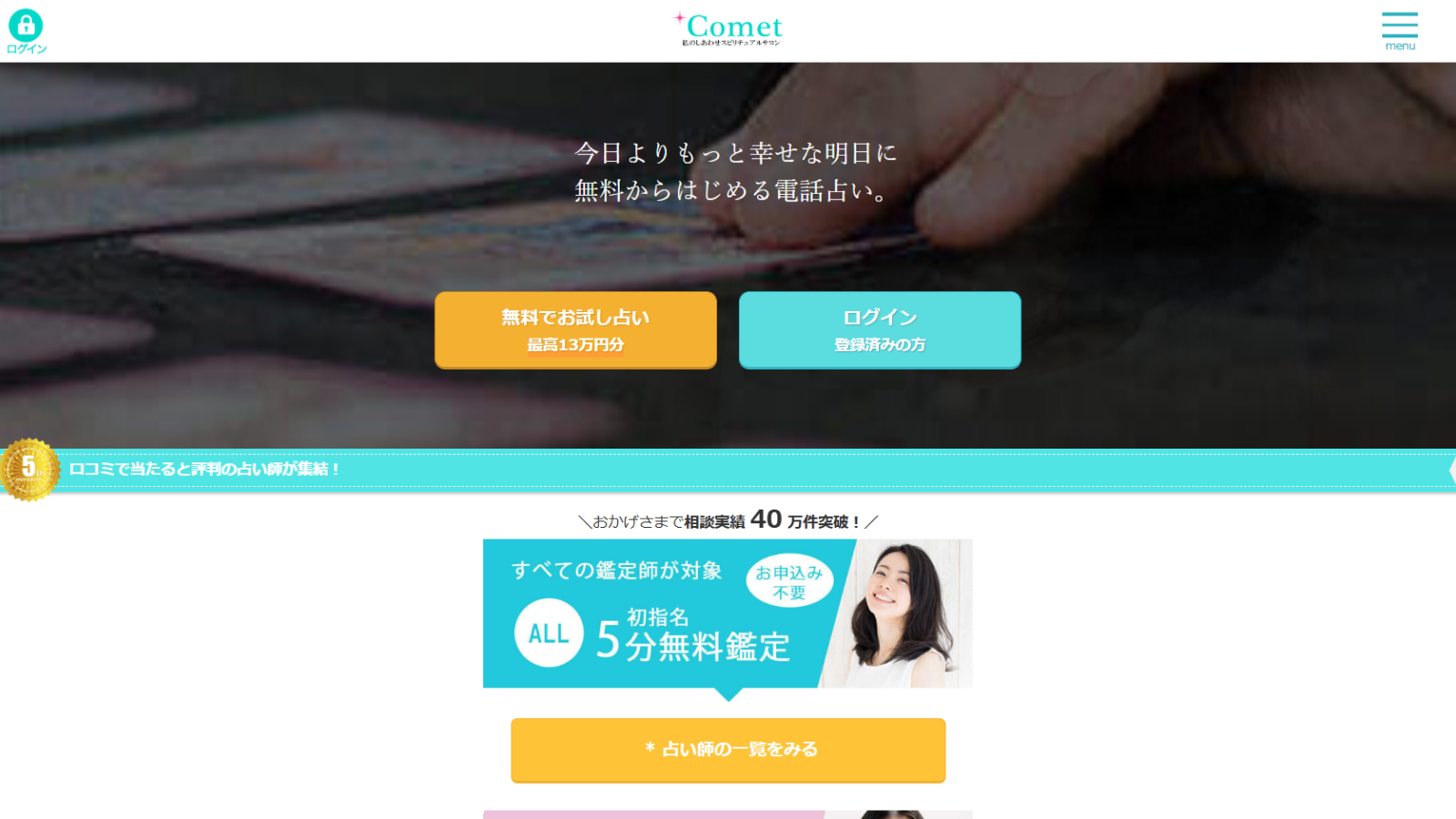 「よく当たる」と評判の電話占いコメット。初回はなんと、どの占い師を選んでも5分間無料でお試しできます。実力派の占い師があなたの悩みに寄り添い、的確なアドバイスで解決へと導きます。